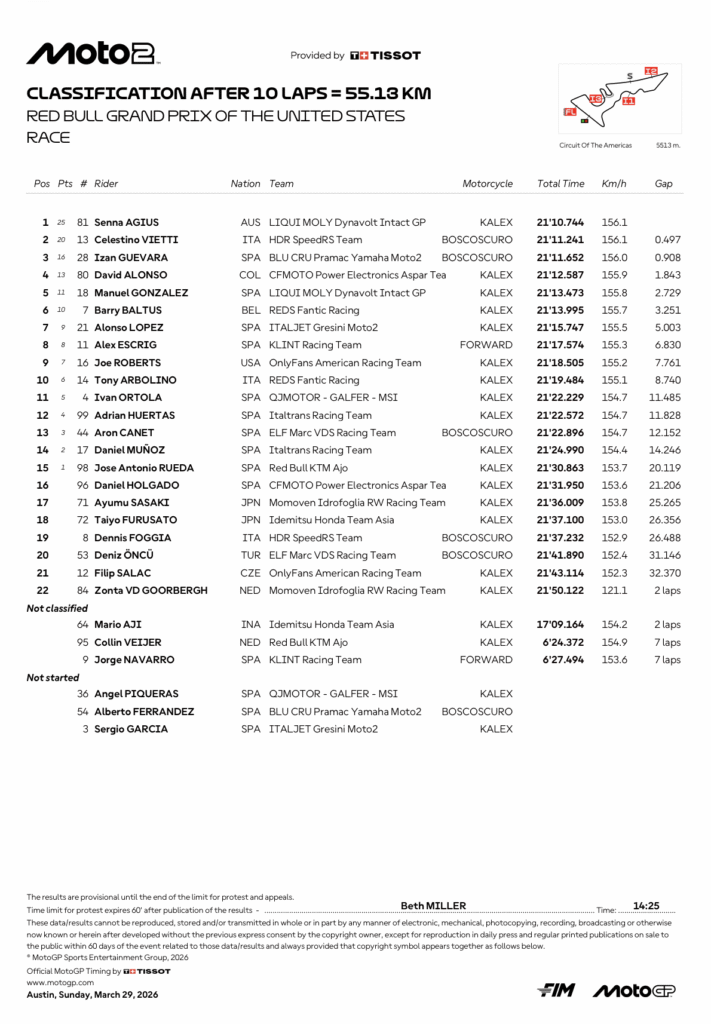 Before the race restarted, Holgado was handed a long lap penalty for causing the crash with Roberts, while Munoz and Baltus were given the same punishments for “unsafe change of direction” during the first lap. Deniz Öncü crashed on the sighting lap but was able to remount and join the grid for the start.
