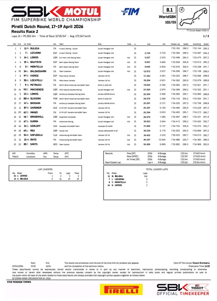 WSBK: Nicolo Bulega Makes It a Hat-Trick of Hat-Tricks with Victory at Race Two in Assen