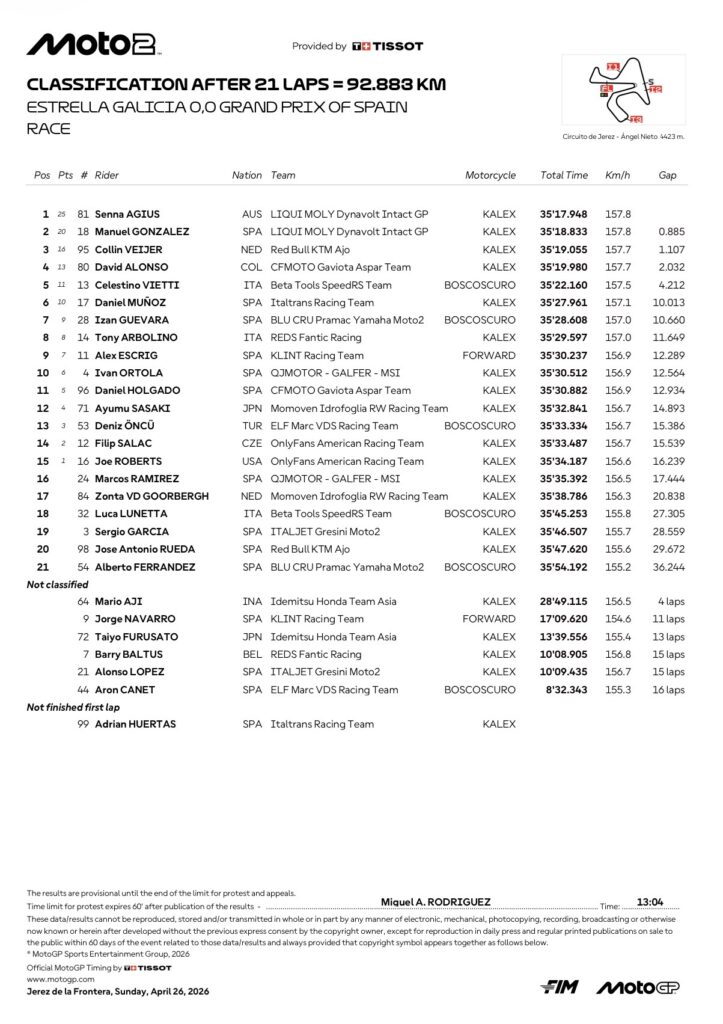 David Alonso finished in 4th place, ahead of Vietti and Dani Muñoz, with Guevara, Tony Arbolino (REDS Fantic Racing), Escrig, and Ivan Ortola (QJMOTOR – GALFER – MSI) rounding out the top ten.